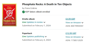 Today I put the ebook of Phosphate Rocks: A Death in Ten Objects back on sale through Barnes & Noble and KOBO, removed it from Kindle Unlimited, and updated all print pricing.